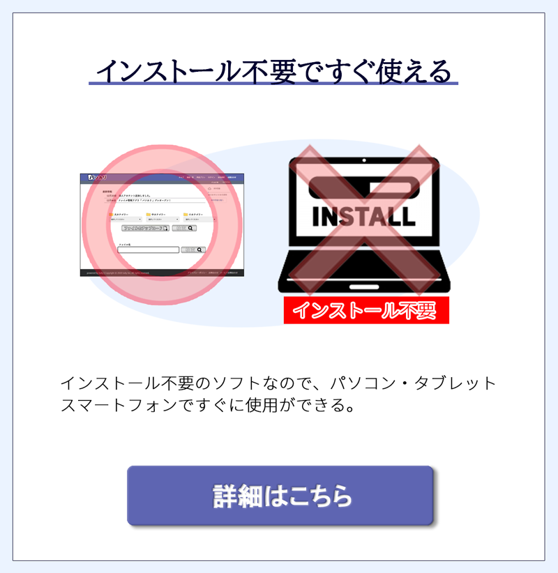 使い方はすごく簡単シンプルで、インターネットにつながるパソコンがあればブラウザからID・パスワードでアクセスすればファイルをアップロードができます。もし、突然パソコンが壊れても大事なファイルはパソカリからダウンロードが可能です。アップロード時はフォルダを選択するだけで、ファイル名が自動的に決定し簡単に保存が可能です。請求書の場合は、会社名のフォルダを選択するとインボイス登録番号("T"を除く13桁の半角数字)がファイル名に自動的について保存します。日々の面倒な領収書管理もスマホで撮影すれば、ファイル名が日本語で自動につき月額ごとにデジタルデータとして保存・ダウンロードができます。管理画面で領収書一覧も閲覧でき、月額の領収書の項目別合計金額も自動計算表示します。これで、税理士の先生にも整理された領収書が簡単に提出できます!PDFファイル・画像ファイル等はアップロードするだけで自動リサイズがかかりファイルの重さを軽くすることができます。各PDFのページや画像はアップロード時に回転やページの部分的な削除が簡単にできます。パソカリがあれば多数のアプリを使用せずにパソカリ一つで管理・編集・検索が可能となります。スマホ・タブレットからアクセスすれば、ファイルの閲覧やLINEで簡単に送ることができます。特定の方(例 : 税理士の先生)に請求書のフォルダだけを共有アクセスすることもできます。この場合、ファイル自体をサーバでウイルススキャンを自動で行いますので安全にファイルを共有ができます。